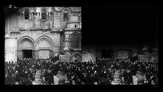 Jérusalem, l’entrée du St Sépulcre un jour de fête religieuse. La foule des pèlerins se presse dans l’unique porte. Rare cliché qui montre le petit peuple chrétien oriental, et non des pèlerins Européens, comme c’est presque toujours le cas dans les photos anciennes. On voit des pèlerins modestes si ce n’est pauvres, des popes, etc. En vente, sur le dallage, des reproductions d’icônes, des articles de piété populaire. Cliché stéréoscopique du père A. Jaussen, verre 7 x 13 cm. Année indéterminée, fin de l’époque turque ou tout début du Mandat britannique.