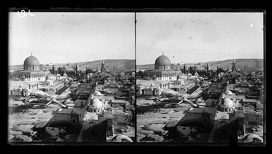 Jérusalem. Vue stéréoscopique de l’esplanade des mosquées, ou Haram, avec le Dôme du Rocher, et, en arrière-plan, au centre, al-Aqsa. Sur la droite, la partie du quartier musulman de la vieille ville qui jouxte le Haram. Vu depuis le minaret qui est à l’angle nord-ouest du Haram. Photo du père A. Jaussen, dominicain, vers 1905-10. Verre 7 x 13 cm, conservé à l’École biblique.